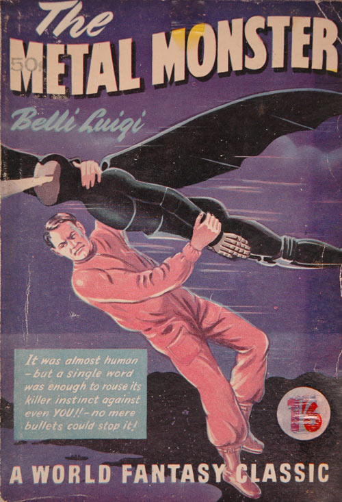 G. C. Bleeck, another contributor to Thrills Incorporated, wrote The Metal Monster and Master-mind Menace under Belli Luigi, one of his many pseudonyms. When the cover of The Metal Monster was re-used (a usual occurrence) for Crime Flies the man had changed from spacesuit and boots to pyjamas and no shoes. The robot’s light beam had changed to X-ray vision.