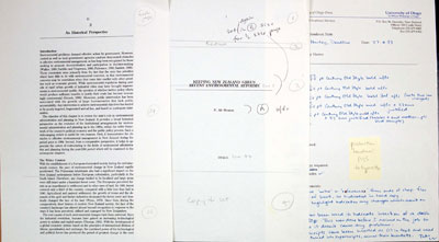 Production handover notes from Harrex to Deadline Typesetting, Stewart Street, Dunedin, were specific: the text to be set in various point sizes of Century Old Style, text justified, galley proofs were required, page size determined (4 ems gutter; almost 6 ems towards fore-edge), and 'notes' and 'references' were to be placed as endnotes. Importantly, all the files were supplied on a computer disk. On display is a sample setting of chapter 2, faxed from Deadline to the Press.