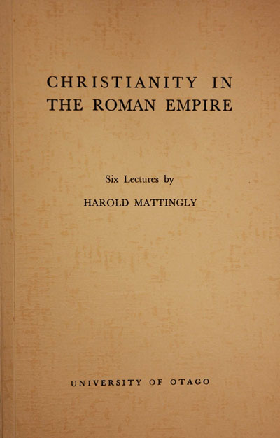 E. H. McCormick, The Expatriate. A Study of Frances Hodgkins. Wellington: New Zealand University Press, 1954. Brasch ND 1108 H6 M318; Harold Mattingly, Christianity in the Roman Empire. [Dunedin]: University of Otago, 1955.