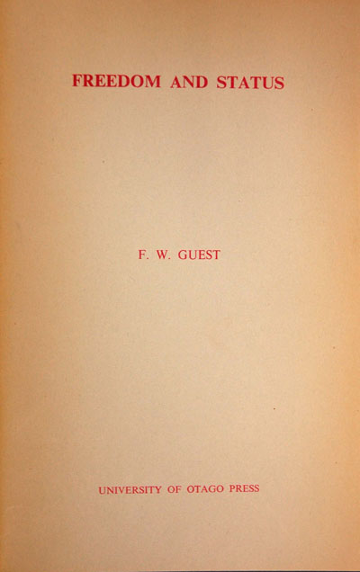 In its infancy, the Press decided on a standard format that was determined for both linotype and monotype setting. Although the publications were rather thin monographs, often given away or sold of at a nominal sum, standards of production remained paramount. Advertising was also necessary. Printed on the back cover of Guest's Freedom and Status (1961) were the details of the University of Otago publications, as well as the UOP ones, each at tantalisingly 'olde worlde' prices. Fraenkel's Lister displays a new initiative; the use of two colour for the front cover.