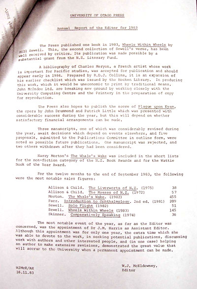 W. J. McEldowney, 'Annual Report of the Editor for 1983,' 16 November 1983. Otago University Press Archives.
