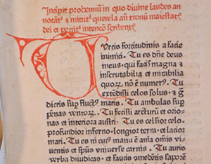 Binding, rubricated initial f.5a, coloured woodcut f.10a, notes on preliminary page.