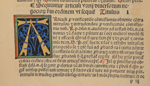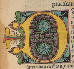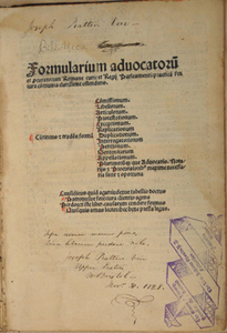 Paper. 230 leaves (last leaf blank); 200 x 140 mm (quarto). Gothic type. Title-page present. Imprint from colophon: 'Formulariu Aduocatoru[m] et Procurator Romane curie et Regij parleameti': practica ostendes fm iura comunia: exactissima diligentissima impssum Basilee Anno dni M. CCCC.lxxxxiij. sexto ydus Marij. Finit foeliciter. Rubricated. Some woodcut initials. One hand-coloured initial at beginning of text proper (f.7a)