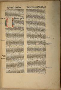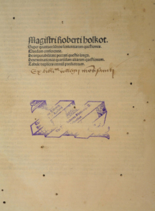Paper [194] leaves; 285 x 205 mm (fol.). Gothic type. Double columns. F.1a Title-page: 'Magistri Roberti holkot Super quattuor libros sententiarum questiones...' F.1b: Dedicatory letter of Josse Badius (co-editor with Augustinus de Ratisbona) dated 'Ex Lugduno. Xij kalendas Maias, 1497.' Colophon: 'Huius operis diligeter impressi Lugduni a magro Iohane Trechsel alemano. anno salutis nostre. Mccccxcvij. ad nonas Aprilis. charte cosignate huiuscemodi characteribus.' Rubricated (mostly red and some blue and yellow).