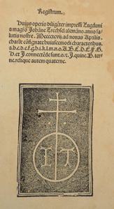 The earliest printings in Lyons are some Latin devotional tracts by Pope Innocent III on 17 September 1473. The printer's name Guillaume Le Roy 'an expert in this typographic art' appears in the colophon. The German-born Johannes Trechsel was an important printer-cum-publisher in Lyons. He was a fellow countryman of Nicolaus Philippi and had presumably been his foreman, as after the latter's death, Trechsel married the widow and soon came into possession of the printing office. His first known book was Caracciolus's Lenten sermons 'de peccatis', printed 4th February 1488/89. Trechsel prided himself on accuracy, clearness of type, and handiness of format. It worked; there was always a steady demand for his productions. Unlike other Lyonnesse presses, he stuck to Latin works, and avoiding the vernacular. The scholar-printer Joducus Bodius Ascensius joined him in 1492. One result of this 'partenrship' was an illustrated edition of Terence in August 1493, which is Trechsels best-known work. He died in 1498; his successor was Johannes Clein. Trechsel's print device is present below the colophon.