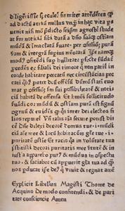 Paper. [36] leaves; 200 x 140 mm (quarto). Rounded Roman type. Brief contents page f.1b. F.2a: Incipit libellus Magistri Thome de Acq'no de modo [con]fitendi. & de puritate [con]scie. F.36a: Explicit Libellus Magistri Thome de Acquino De modo confitendi. & de puritate consciencie Amen. Captial spaces unpainted. Annotations throughout text.