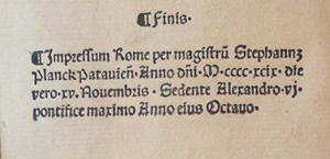 The first book containing Stephan Plannck or Planck's name was the Roman Missal finished on 5 March 1482 (Hain *11377), although he was printing a few years prior to this (See BMC III, p.80). Plannck became a leading printer in Rome, and had the distinction of printing in 1493 the first printed European description of the people and places in America by Columbus.