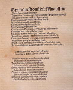 Paper. [286] leaves ; 270 x 190 mm (fol.). Gothic type; two columns per page. F.1a Title: Opus questionu diui Augustini. F.285b Colophon: Impssum est aut hoc op. Lugduni: opa et Impensis. M. Ioanis Trechsel alemaaano salutis nostre Millesimo quadringentesimo nonagesimoseptimo. Vij. Kalen. Maias. [Device]. Edited by Augustinus de Ratisbona and Jodocus Badius Ascensius. Last leaf wanting.