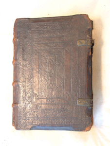Rebacked; wooden boards with ornate stamped covers. One brass clasp remaining. Small fragment of spine label present.