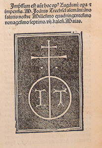 The earliest printings in Lyons are some Latin devotional tracts by Pope Innocent III on 17 September 1473. The printer's name Guillaume Le Roy 'an expert in this typographic art' appears in the colophon. The German-born Johannes Trechsel was an important printer-cum-publisher in Lyons. He was a fellow countryman of Nicolaus Philippi and had presumably been his foreman, as after the latter's death, Trechsel married the widow and soon came into possession of the printing office. His first known book was Caracciolus's Lenten sermons 'de peccatis', printed 4th February 1488/89. Trechsel prided himself on accuracy, clearness of type, and handiness of format. It worked; there was always a steady demand for his productions. Unlike other Lyonnesse presses, he stuck to Latin works, avoiding the vernacular. The scholar-printer Joducus Bodius Ascensius joined him in 1492. One result of this 'partnership' was an illustrated edition of Terence in August 1493, which is Trechsel's best-known work. He died in 1498; his successor was Johannes Clein. Trechsel's print device is present below the colophon.