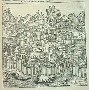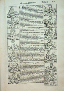 Adam and Eve (f.66a), King and book img (f.151b), Nuremberg (f.99b and 100a), title-page sample, Epitoma operum (f.1a), binding and front endpapers, colophon, comet (f.186a), Constantinople (f.249a), Cyclops (detail from f.12a), Anthropagamai characters (f.12a), solar system (f.4a).