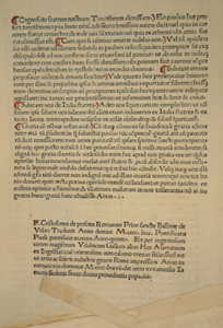 Paper. [278] leaves; 320 x 225 mm. (fol.) Roman type. Large rips through first 50 pages. Library copy incomplete: wants first 10 leaves. Begins: 'iudeos auctoritas patefacit...' F.277a Colophon: F. Cristoforus de persona Romanus prior sancte Balbine de Vrbe: traduxit Anno domini M.cccc.lxix ... per ... Vdalricum Gallum alias Han Alamanum ex Ingelstat ... Rome impressum Anno in carnationis dominice Mcccclxxvii die uero xxv mensis Januarii Sedente sixto divina providentia papa.iiii. F.277b: D Romanos ex Corintho... F. 278a [end of text]: tanta posset moles imponi. F. 278b: Primum uacat... Rubricated throughout.
