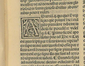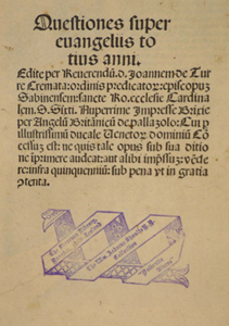 Paper. [166] leaves; 190 x 135 mm (quarto and octavo). Gothic type. Two columns. F.1a Title-page and privilege: Questiones super euangeliis totius anni... Impresse Brixie per Angelu Britanicu de pallazolo... F.166b: colophon: Questiones euangeliorum tam de tempore quam de sanctis collecte per R.D. Ioanem de Turre Cremata ... Impresse Brixie Anno M.cccc.xcviij. die. ij Iunij per Angelum Britanicum de palazollo: Ad laudem dei et eius genitricius marie... Guide letters with capital spaces. Woodcut initials.