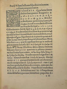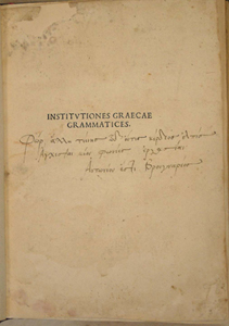 Paper. [428] p. ; 210 x 155 mm (quarto). Greek and Roman type; woodcut capitals. F.1a: Title-page: INSTITVTIONES GRAECAE GRAMMATICES. Errata on last four pages (unlike Hain). Last leaves defective and repaired, effecting a few lines of text. F.212a Colophon: Venetiis in aedibus Aldi Manutii Romani. M.IIID. mense Ianuario...'