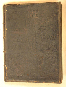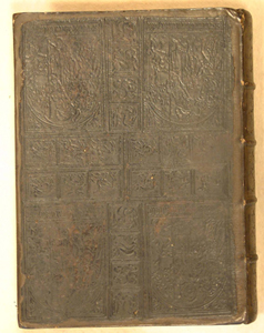 Rebacked calf with animals and Christ-like figure blind stamped on covers.
