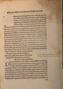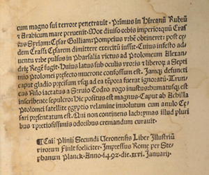Paper. [2], [18] leaves; 210 x 140 mm (quarto). Gothic type. Prelim. leaf in manuscript. F.1a 'Angelus Tiphernas Alexandro Iustino'. Colophon: f.18a: 'Caij Plinij Secundi Veronensis Liber Illustriu virorum Finit foeliciter. Impressus Rome per Stephanum Planck. Anno 1492. die. xxvi. Ianuarii.' First initial decoration wanting; some pages loose. Contemporary annotations in margin.
