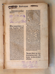 Petrus Ungarus, a Hungarian, known in the vernacular as Pierre Hongre. The first known books signed by this printer are the Vocabularius Breviloquus (1482) and the above work, a possible reprint of the Philippi and Reinhardt 1480 edition. Between 1483 and 1491, Petrus disappears, and then reappears in Toulouse in the latter year. He is printing up to and including the year 1500. In the colophon of his books Petrus credits himself as 'a man greatly skilled in the printing art' ('magister'), yet by 1500 he was excused payment of taxes on the ground of poverty. (BMC VIII: li). Given this, he was somewhat enterprising. He supplied Greek type where it was required, instead of leaving spaces to be filled in by hand.