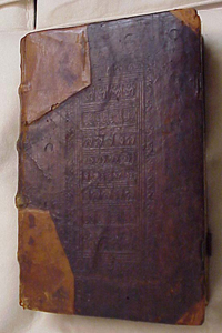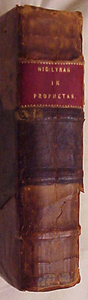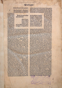 First page of text proper (Incipit prologus), explicit, binding and spine; fragment sample.