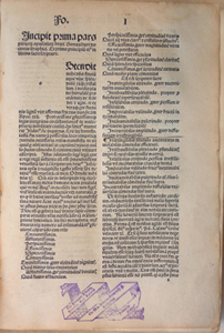 Paper. [26], CCLV (i.e. 353), [1] leaves; 275 x 190 mm (fol.). Gothic type; double columns. Copy lacks 2 of the preliminary leaves, XXIII-XXX (whole of sig. d), and the final 3 leaves (including colophon and blank). Text begins after tabula: 'Incipit prima pars parvo[rum] opusculo[rum] beati Bonave[n]ture doctoris seraphici'. Guide letter unpainted.
