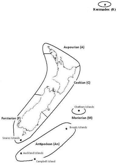 The geographical range of each marine taxon is indicated by the codes K. A., C., F., M., and An. These symbols denote Powell's New Zealand zoogeographical provinces, with the addition of K. for the Kermadec Islands, and are defined in the table below. Although the concept of zoogeographical provinces has severe limitations (especially when applied to deep water species), these symbols do give some approximation of the geographical range of a species. An E denotes an endemic species and an I an adventive (introduced) form. Species inhabiting freshwater habitats are indicated by the abbreviation FW, and landsnails by L; their ranges are denoted by N for the North Island and S for the South Island, and other islands by standard abbreviations. Mesoginella koma is thus found around the north-eastern coast of the North, Island and is endemic to the New Zealand EEZ.